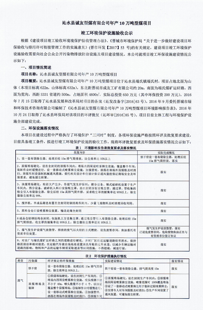 沁水縣誠(chéng)友型煤有限公司年產(chǎn)10萬(wàn)噸型煤項(xiàng)目竣工環(huán)境保護(hù)設(shè)施驗(yàn)收公示